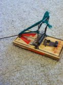 Step 6 – Take your mouse trap and tie multiple strands of fishing line/invisible thread and tie it to the part of the mouse trap that snaps down and would normally hit the mouse. Tape the other end of the string to bottom of the mouse trap. Make it long enough so if the mouse trap went off it would stop half way, like this (in this case I used yarn so you can see it. It really doesn’t matter what kind of string you use for this step, as long as it’s strong enough, because you’ll spray paint it anyway):