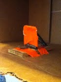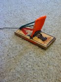 Step 8 – Place the mouse trap (mouse-hitting side facing out of the box) between the slits you made in step 5. Tape the mouse trap down by threading a long piece of tape up through one slit, over part of the mouse trap, and back out the second slit. Make sure that the mouse trap will still fire half way, and that you didn’t accidentally tape the mouse-hitter thing down: